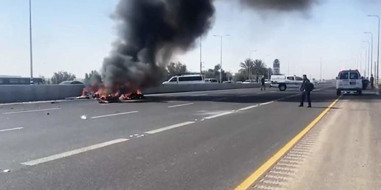 На кадрах видны горящие обломки на шоссе и несколько автомобилей поблизости. Магистраль была закрыта в обоих направлениях.