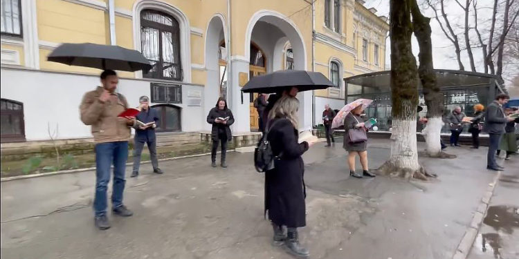 Несмотря на плохую погоду, у здания собралось несколько десятков человек, которые выражают несогласие с законопроектом о передаче здания в собственность Бессарабской митрополии.